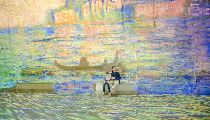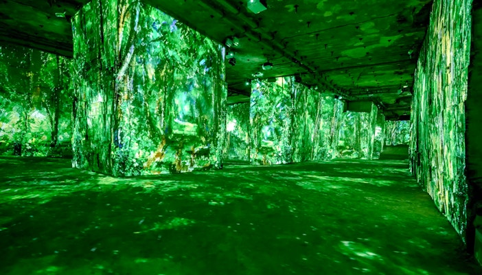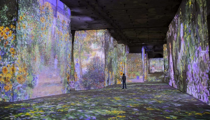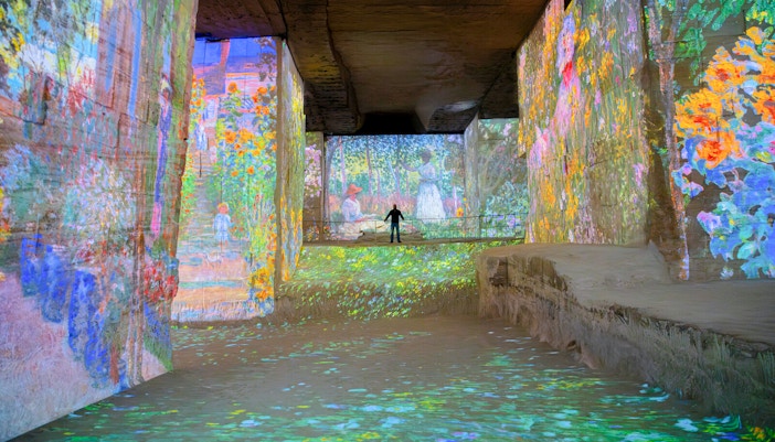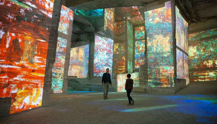 Masywne filary kamieniołomu i długie korytarze tworzą wielokątne "ekrany". Sceny owijają się wokół rogów, rozciągają po sufitach i kaskadowo spływają po chropowatych kamiennych teksturach, nadając dziełom sztuki rzeźbiony, wymiarowy wygląd, którego nie uzyskasz w miejscach o płaskich murach.